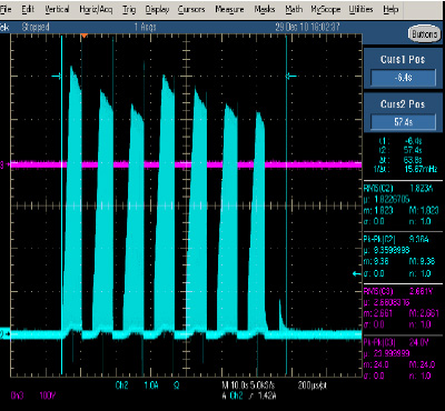 可見LVR100的典型值組件在0C/25C溫度下馬達(dá)保護(hù)時間還會更快,完全滿足小于150S的馬達(dá)保護(hù)要求。圖7為在25度下馬達(dá)堵轉(zhuǎn)保護(hù)的實測波形。