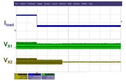 圖4. 兩相均流控制的效果:(上圖)啟用均流控制;(下圖)禁用均流控制。