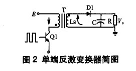 功率轉換部分采用單端反激電路,結構如圖2。當加到原邊主功率開關管Q1的激勵脈沖為高電平使Q1導通時,直流輸入電壓加在原邊繞組兩端,由于此時副邊繞組相位是上負下正,整流管D1反向偏置截止,原邊電感儲存能量;當激勵脈沖為低電平使Q1截止時,原邊繞組兩端電壓極性反向,副邊繞組相位變為上正下負,整流管正向偏置導通,變壓器儲存的能量向副邊釋放。在此開關過程中,高頻變壓器既起變壓隔離作用,又起電感儲能作用。