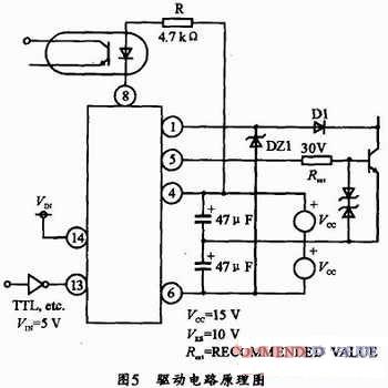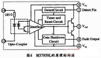 M57959L是日本三菱公司生產(chǎn)的混合集成IGBT驅動器,其內部原理結構如圖4所示。它由高速光電隔離輸入,絕緣強度高,可與TTL電平兼容。內藏定時邏輯短路保護電路,并具有保護延時特性。芯片由正負電源供電,克服了單電源供電時負電壓不穩(wěn)的缺點,驅動功率大,可驅動200A/600V或100A/1200V的IGBT模塊。由M57959L構成的驅動電路如圖5所示。