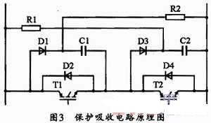 由于電路中分布電感的存在,加之IGBT開關速度較高,當IGBT關斷時及與之并接的反向恢復二極管逆相恢復時,會產(chǎn)生很大的浪涌電壓Ldi/dt,從而威脅IGBT的安全。因此必須采取措施抑制浪涌電壓,保護IGBT不被損壞。可以采用加裝保護吸收電路的辦法來抑制浪涌電壓。其原理圖如圖3所示,該保護吸收電路有良好的抑制效果,具有保護吸收中發(fā)生損耗小的優(yōu)點。