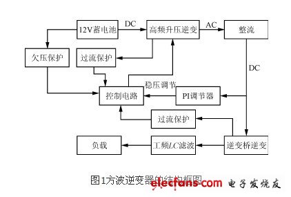 目前,構(gòu)成DC/AC逆變的新技術(shù)很多,但是考慮到具體的使用條件和成本以及可靠性,本電源仍然采用典型的二級(jí)變換,即DC/DC變換和DC/AC逆變。首先由DC/DC變換將DC 12V電壓逆變?yōu)楦哳l方波,經(jīng)高頻升壓變壓器升壓,再整流濾波得到一個(gè)穩(wěn)定的約320V直流電壓;然后再由DC/AC變換以方波逆變的方式,將穩(wěn)定的直流電壓逆變成有效值稍大于220V的方波電壓;再經(jīng)LC工頻濾波得到有效值為220V的50Hz交流電壓,以驅(qū)動(dòng)負(fù)載。