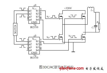 如圖3所示,DC/AC變換采用單相輸出,全橋逆變形式,為減小逆變電源的體積,降低成本,輸出使用工頻LC濾波。由4個(gè)IRF740構(gòu)成橋式逆變電路,IRF740最高耐壓400V,電流10A,功耗125W,利用半橋驅(qū)動(dòng)器IR2110提供驅(qū)動(dòng)信號(hào),其輸入波形由SG3524提供,同理可調(diào)節(jié)該 SG3524的輸出驅(qū)動(dòng)波形的D<50%,保證逆變的驅(qū)動(dòng)方波有共同的死區(qū)時(shí)間。