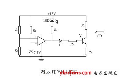 圖5中運(yùn)算放大器的正向輸入端的電壓由R1和R3分壓得到,而反向輸入端的電壓由穩(wěn)壓管箝位在+7.5V,當(dāng)蓄電池的電壓下降超過預(yù)定值后,運(yùn)算放大器開始工作,輸出跳轉(zhuǎn)為負(fù),LED燈亮,同時(shí)三級(jí)管V截止,向SG3524的SD端輸出高電平,封鎖IR2110的輸出驅(qū)動(dòng)信號(hào)。