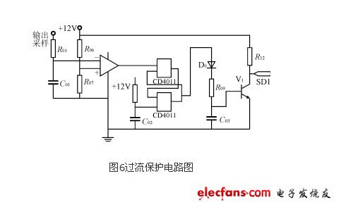 過流保護(hù)電路如圖6所示,它監(jiān)測(cè)輸出電流狀況,預(yù)設(shè)為1.5A。方波逆變器的輸出電流經(jīng)過采樣進(jìn)入運(yùn)算放大器的反向輸入端,當(dāng)輸出電流大于1.5A后,運(yùn)算放大器的輸出端跳轉(zhuǎn)為負(fù),經(jīng)過 CD4011組成的R-S觸發(fā)器后,使三級(jí)管V1基級(jí)的信號(hào)為低電平,三級(jí)管截止,向IR2011的SD1端輸出高電平,達(dá)到保護(hù)的目的。