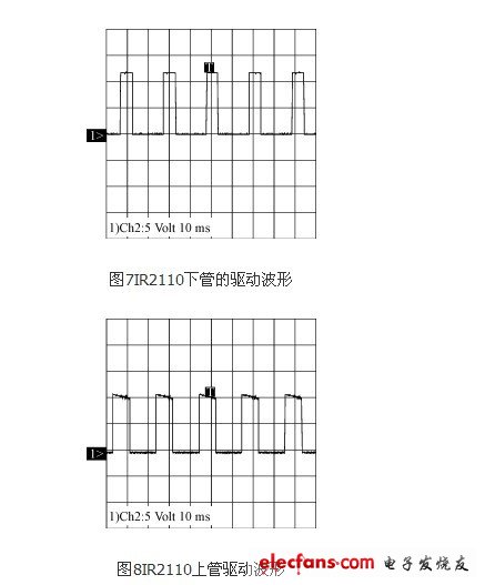 調(diào)試過程遇到的一個(gè)較為重要的問題是關(guān)于IR2110的自舉電容的選擇。IR2110的上管驅(qū)動(dòng)是采用外部自舉電容上電,這就使得驅(qū)動(dòng)電源的路數(shù)大大減少,但同時(shí)也對(duì)VB和VC之間的自舉電容的選擇也有一定的要求。經(jīng)過試驗(yàn)后,最終采用1μF的電解電容,可以有效地滿足自舉電壓的要求。