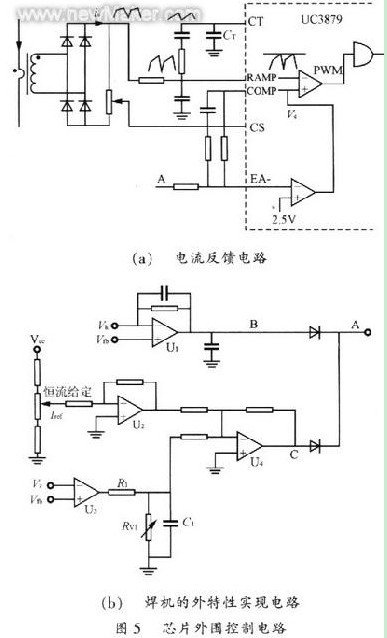 為了實現前述逆變焊機恒流帶外拖的特性曲線,本方案選用UNTRODE公司的專用集成移相芯片UC3879,并配合外圍電路,通過多環分段控制方法來完成控制要求。