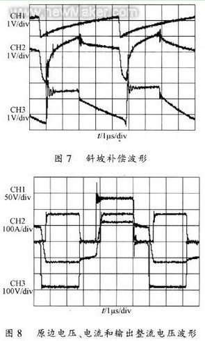 圖7為電流斜坡補償波形。通道3為原始電流采樣波形;通道1為用于補償的鋸齒波;通道2為補償后波形。補償后斜率明硅增加。 圖8所不為原邊電壓(通道3)、原邊電流(通道2)和輸出整流電壓(通道1)波形。從圖8中可清楚地看出占空比損失。