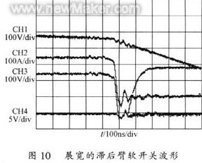 其中通道l和通道2分別為原邊電流、電壓波形;通道3為滯后臂管壓降,通道4為其驅動波形。圖10是圖9的局部展寬波形。從中可以明顯地看到當滯后臂管壓降已經諧振到零后,驅動脈沖才由低變到高,使其在零電壓下導通,實現軟開關。