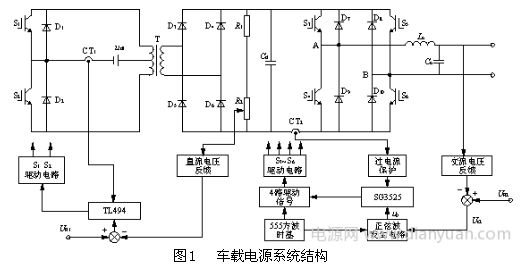 傳統車載電源一般采用逆變器加工頻變壓器的方案,它存在體積大、效率低等缺陷。隨著新型電力電子器件和電力電子技術的發展,采用高頻鏈的方案來實現無工頻變壓器的逆變電路,可以很好地解決傳統車載電源存在的問題,同時能保證車載電源的輸出電壓更穩定、更平滑。