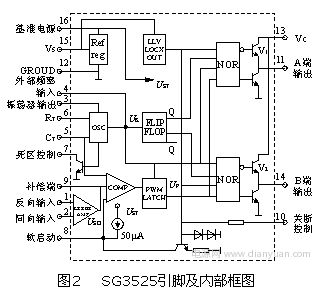 系統采用SG3525來實現SPWM控制信號的輸出,該芯片其引腳及內部框圖如圖2所示。