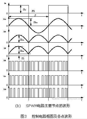 要得到正弦電壓的輸出,就要使逆變電路的控制信號以SPWM方式控制功率管的開關,所得到的脈沖方波輸出再經過濾波就可以得到正弦輸出電壓。通過SG3525來實現輸出正弦電壓,首先要得到SPWM的調制信號,而要得到SPWM調制信號,必須得有一個幅值在1~3.5V,按正弦規律變化的饅頭波,將它加到SG3525腳2,并與鋸齒波比較,就可得到正弦脈寬調制波實現SPWM的控制電路框圖如圖3(a)所示,實際電路各點的波形如圖3(b)所示。