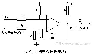 過電流保護采用電流互感器作為電流檢測元件,其具有足夠快的響應速度,能夠在IGBT允許的過流時間內將其關斷,起到保護作用。如圖1所示,過流保護信號取自CT2,經分壓、濾波后加至電壓比較器的同相輸入端,如圖4所示。當同相輸入端過電流檢測信號比反相輸入端參考電平高時,比較器輸出高電平,使D2從原來的反向偏置狀態轉變為正向導通,并把同相端電位提升為高電平,使電壓比較器一直穩定輸出高電平。同時,該過電流信號還送到SG3525的腳10。當SG3525的腳10為高電平時,其腳11及腳14上輸出的脈寬調制脈沖就會立即消失而成為零。