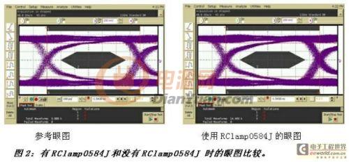 給HDMI接口增加ESD保護(hù)時(shí),必須保證確保器件對信號完整性的影響最小。眼圖測試可以顯示源接口上的任何信號失真,眼圖可采用圍繞HDMI眼罩構(gòu)成一個(gè)“開放”眼的位模式,這種干凈的眼圖能夠驗(yàn)證良好的信號完整性。圖2給出了眼圖測試的一個(gè)例子。作為參考基準(zhǔn),左圖是沒有任何保護(hù)的HDMI視頻信號,右圖則是增加了TVS保護(hù)器件后的HDMI接口信號。可以看出RClamp0584J對眼圖的信號完整性影響非常小。