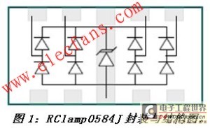 RClamp0584J是這種集成式TVS保護(hù)器件的一個(gè)最佳實(shí)例(圖1)。該器件是RailClamp系列高速接口保護(hù)產(chǎn)品的最新成員。這種四線、5V工作電壓保護(hù)器件的性能超出了IEC 6100-4-2 level 4對靜電瞬變的保護(hù)要求。圖1同時(shí)也明確顯示,這款器件采用了獨(dú)特的封裝設(shè)計(jì)。“穿通型(Flow through)”封裝一詞來自升特公司,這種封裝允許走線直接穿過保護(hù)器件,因此最大限度地減小了由于平衡差分線對的中斷或失配所導(dǎo)致的額外寄生電感與電容。