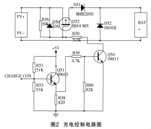 單片機(jī)(P2.0)給出充電的控制信號,即P2.0=1,NPN 型S9013 的三極管導(dǎo)通,由于此三極管工作于射極輸出狀態(tài), 其發(fā)射極為高電平,Q54 (2SD667)NPN 三極管導(dǎo)通, 由于穩(wěn)壓管D50的作用, 使得IRF4905管的柵源電壓鉗位在-10V,IRF4905 管導(dǎo)通, 太陽電池向蓄電池充電。反之,前兩極三極管均截止VGS=0V,IRF4905 管斷開,太陽電池不能向蓄電池充電。