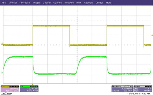 透過軟啟動電容器 C5 的短路快速地開/關轉換器,是調節 LED 亮度一種簡單的方法。圖 2 顯示了 PWM 輸入訊號和實際的 LED 電流。這種 PWM 亮度調節方法較為有效,因為轉換器關閉并且在 SS 接腳短路時僅消耗極少的功率。但是這種方法也相對較慢,因為轉換器每次開啟時都必須以一種可控制方式逐漸升高輸出電流,進而在輸出電流上升以前產生一個非線性、有限的停滯時間 (dead-time)。同時,這也將開啟時間的最小負載周期降低至 10%-20%。在一些不要求高速和 100% PWM 調節的 LED 應用中,這種方法或許就已足夠。