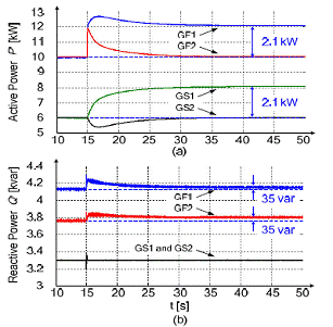 一段時間后,二次控制器控制逆變器動作,第一個電網上的階躍負載只由第一個電網上的逆變器補償。交換功率受到控制重新回到之前的設定值。不同逆變器的無功功率如圖7b所示。開始時,所有逆變器提供的無功功率都近似為14.6kvar。15s的時候,第一個電網的無功功率增加了70var。正如前面提到的,本次仿真并沒有對無功功率進行二次控制。電網形成方式的逆變器補償增加的階躍負載,電網支持方式的逆變器提供相同數量的無功功率。