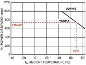 環(huán)境溫度低于70℃時,TSOP-5和µDFN-6封裝都可以耗散720mW的功率,因此能滿足這一應(yīng)用的最壞情況要求。然而,µDFN-6封裝的功率耗散能力更強,與采用TSOP-5封裝的同等轉(zhuǎn)換器設(shè)計相比,能夠承受的溫度更高。