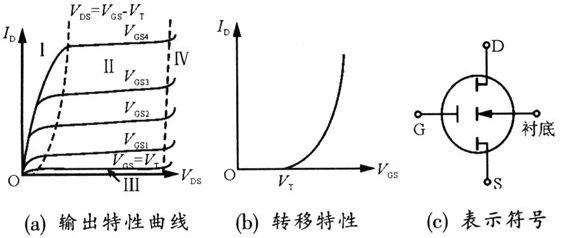 圖2 N溝道增強型絕緣柵場效應管的特性曲線和表示符號[page]