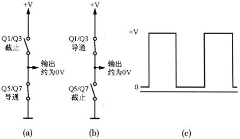 在射頻激勵信號的負半周,MOS管QI/Q3截止,QS/Q7導通,如圖5(a)所示。而在射頻激勵輸入信號的正半周,MOS管Q1/Q3導通,QS/Q7截止,如圖5(b)所示。Q2/Q4和Q6/Q8的開關情況與此正好相反。跨在功率合成變壓器初級兩端的輸出信號就在半個周期里,在地(約為0V)和正電源間進行一次切換,如圖5(c)所示。