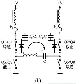 因為在用的功放模塊產生的射頻電流必須流過合成變壓器的次級,并在已關斷的射頻功放模塊的初級繞組上感應出射頻電壓。根據楞次定律,變壓器次級電流所產生的磁通總是試圖抵消初級電流所產生的磁通,所以,流過關斷功放輸出變壓器次級的電流感應到初級的電壓后,一定和原來的輸出電壓極性相反。在如圖6(a)所示,由次級電流感應到初級的電壓為左正右負,說明關斷的射頻功放在導通狀態下的變壓器初級電壓極性是左負右正,與此相對應的導通管為Q2/Q4,截止管為01/Q3,從而形成的低阻抗通路為:與Ql/Q3相并聯的反向二極管→旁路電容C1、C3→旁路電容C2、C4→Q2/Q4→隔直電容C。同理,圖6(b)所形成的低阻抗通路為:與Q2/Q4相并聯的反向二極管→旁路電容C2、C4→旁路電容C1、C3→Q1/Q3。