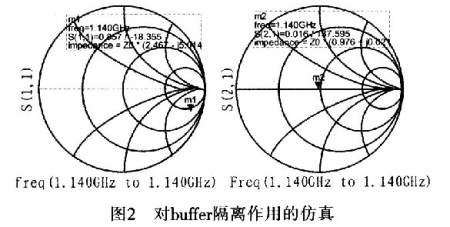 圖2是對buffer隔離作用的仿真。通過仿真發(fā)現(xiàn):壓控振蕩器與外部電路相接時,外部電路阻抗的變化不會對壓控振蕩器的阻抗產(chǎn)生影響。