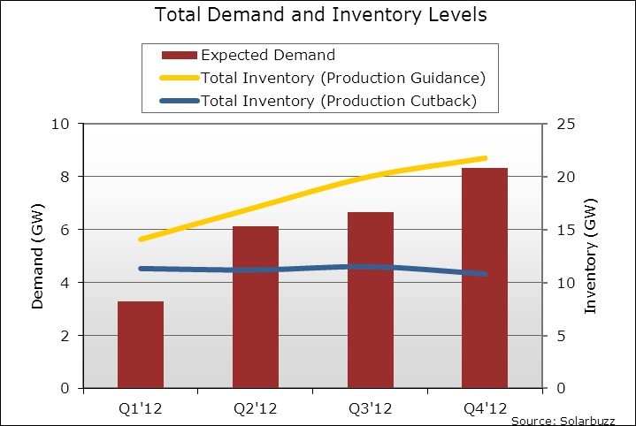 在產能過剩的情況下,如果不能有效控制產量,明年年底組件庫存有可能飆升至22GW。為了使庫存天數維持在與2011年底一樣的水位,產量需要比廠商的計劃減少約11GW。