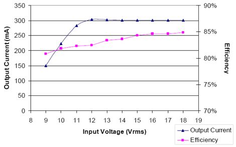 在電路配置方面,VBAT的額定電壓為-0.3至+40 V,因此整流橋上的輸入電壓高達(dá)24 Vac也是安全的。要保持較高輸入電壓水平就需要一個(gè)大容量的C1。大幅波動(dòng)的經(jīng)整流的AC電流將在雙倍AC線路頻率條件下把輸出電流拉至零,因此減少了輸出電流。220 μF的電容對這個(gè)設(shè)計(jì)已經(jīng)足夠了。對于12 Vac輸入,C1額定電壓應(yīng)該是25 V。由于需要較低的正向電壓,整流橋選用了MBR0520L表面貼裝肖特基二極管。