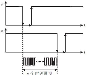 當無運動物體遮擋光電開關時,光電開關的接收端輸出高電平信號,當有物體經過遮擋時,光電開關的接收端輸出低電平信號。即當高速物體經過一對光電開關時會先后形成2 個高電平到低電平的脈沖信號。通過計時周期的方式測出這2 個下降沿之間的計數周期個數n,計時原理如圖1 所示。