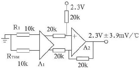 UC3909 內部集成了具有鉛酸蓄電池溫度補償功能的電路如圖4 所示, A1 為電流/ 電壓轉換元件, 其輸入端分別接10 kΩ   普通電阻及10 k Ω  熱敏電阻。A2 與外接四個20 kΩ  電阻組成差動運算放大電路。RT HM 一般貼附在鉛酸蓄電池的表面殼體用于檢測其溫度, 當鉛酸蓄電池內部溫度變化時, 通過熱敏電阻RTHM 的反饋使U C3909 的基準電壓2. 3 V 也隨溫度按- 3. 9 mV/℃ 的溫度系數變化。從而確保鉛酸蓄電池在浮充狀態下準確工作于安全的浮充電壓, 保護了鉛酸蓄電池。