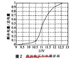 系統(tǒng)工作時間與電池電量成線性關(guān)系, 而電量與電池端電壓為非線性關(guān)系。圖2 所示為本系統(tǒng)所用電池在2 000 mA 恒流放電的情況下, 電池端電壓與電量的關(guān)系曲線, 其中橫軸為電池電壓, 縱軸為剩余電量相對于總電量的百分比。根據(jù)此曲線, 在MCU 軟件中擬合一個電壓與電量關(guān)系的數(shù)據(jù)表, 同時設(shè)置10 V為告警電壓; 系統(tǒng)可以實時查詢諸如電池電壓、電流、剩余電量、估計供電時間等信息, 并同時仿手機(jī)做成3段式顯示, 使上位機(jī)全面掌握電池狀態(tài),決定控制策略, 從而提高系統(tǒng)運(yùn)行可靠性。MCU 軟件使用KeiluV2 軟件開發(fā), 上位機(jī)軟件使用LabWindow s 軟件開發(fā)。MCU 除完成電量查詢相關(guān)功能, 還要完成報警與顯示功能; 上位機(jī)軟件同時要完成環(huán)境參數(shù)的相關(guān)采集與處理。