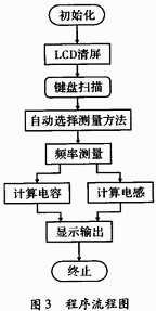 系統(tǒng)上電初始化并且清屏,單片機初始化完成后,進入鍵盤掃描程序,當(dāng)要進行電容或電感測量時,選擇測量按鍵,系統(tǒng)進行自動判斷并進行電容或電感的測量。當(dāng)判斷為電容時,系統(tǒng)選擇電容的計算方法。當(dāng)判斷為電感時,系統(tǒng)選擇電感的計算方法。計算完成后在液晶屏上顯示測量結(jié)果。下面是具體的程序流程圖,如圖3所示。