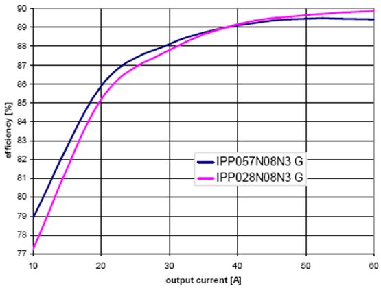 圖8表明了在實際應用中,不同MOSFET RDS(on) 值范圍的影響。圖中所示為在服務器電源中分別測得的IPP028N08N3 G和IPP057N08N3 G的值。