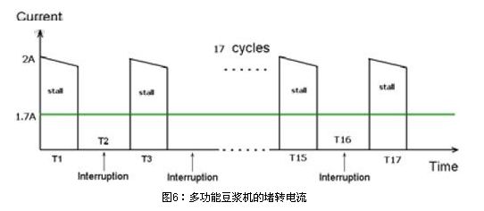 圖6為多功能豆漿機的堵轉電流。在榨水果的堵轉情況下,實測馬達的堵轉最大電流為2A,由于榨果汁時馬達也不是一直連續工作的,也是間隔一定時間工作,間隔時間是馬達工作6S,停3S,這樣換算成在一個榨水果完整工作周期內平均電流是1.6~1.7A。在1.6~1.7A堵轉電流下,馬達堵轉需要保護的時間要求在150S內。
