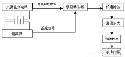 為了解決上述各方法的缺陷,本文采用了四端子測量方式,將蓄電池兩端上的電壓響應信號通過交流差分電路與產生恒定交流源的正弦信號經過模擬乘法器相乘,再將模擬乘法器的輸出電壓信號通過濾波電路,使交流信號轉變為直流信號,直流信號經直流放大器放大后進行模數轉換,將轉換后的值送入單片機進行簡單處理。