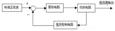 電路組成框圖如圖2所示:這是一個閉環控制系統,電流負反饋電路。標準正弦波產生一個頻率穩定、對稱、失真度低的1KHz正弦波信號。驅動電路把正弦波放大,去推動功放電路,得到正弦交流電流輸出。恒流控制電路從功放輸出中得到的信號,通過與給定的信號相比較,來調節驅動電路的信號,從而使輸出電流保持穩定。