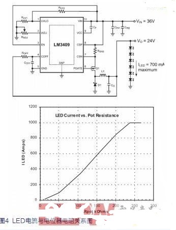 圖4顯示了測(cè)得的LED電流與IADJ引腳和Gnd之間的電位器電阻的關(guān)系圖。1Amp處的平頂表示最大額定LED電流,該值由圖4中所示的電流檢測(cè)電阻 RSNS設(shè)置。