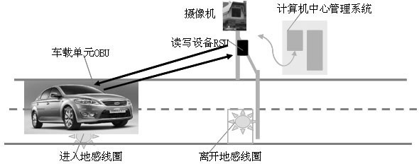 OBU 中存有車輛的識(shí)別信息,如車牌號(hào)、汽車ID號(hào),一般安裝于車輛前面的擋風(fēng)玻璃上,RSU安裝于收費(fèi)站旁邊,環(huán)路感應(yīng)器安裝于車道地面下。中心管理系統(tǒng)有大型的數(shù)據(jù)庫,存儲(chǔ)大量注冊(cè)車輛和用戶的信息。當(dāng)車輛通過收費(fèi)站口時(shí),環(huán)路感應(yīng)器感知車輛,路邊單元發(fā)出詢問信號(hào),車載單元做出響應(yīng)。并進(jìn)行雙向通信和數(shù)據(jù)交換,中心管理系統(tǒng)獲取車輛識(shí)別、車型等信息并和數(shù)據(jù)庫中相應(yīng)信息進(jìn)行比較判斷,根據(jù)不同情況來控制管理系統(tǒng)產(chǎn)生不同的動(dòng)作。通過路邊單元與車載單元進(jìn)行相互通信和信息交換,以達(dá)到對(duì)車輛的自動(dòng)識(shí)別,并自動(dòng)從該用戶的專用帳戶中扣除通行費(fèi),從而實(shí)現(xiàn)自動(dòng)收費(fèi)。