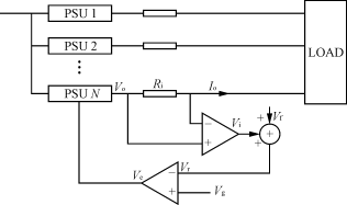 每個模塊的輸出電流采樣,轉化為電壓信號,與給定的電壓Vcc進行比較,所得差值輸入到各電源模塊的控制部分,這樣就可以實現各模塊輸出電流的并聯均流。