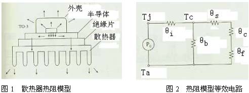 由于散熱器是開關電源的重要部件,它的散熱效率高與低關系到開關電源的工作性能。散熱器通常采用銅或鋁,雖然銅的熱導率比鋁高2倍但其價格比鋁高得多,故目前采用鋁材料的情況較為普遍。通常來講,散熱器的表面積越大散熱效果越好。散熱器的熱阻模型及等效電路如下圖所示。
