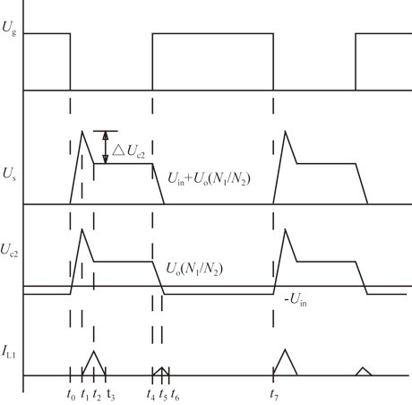 t 2時刻開始,電感L 1給輸入電容C 1回饋能量。C 2電壓被鉗位在(N 1/N 2)U 0、C 0即開關管上電壓為U IN+(N 1/N 2)U 0,均保持不變,到t 3時刻,L 1中能量釋放完畢。