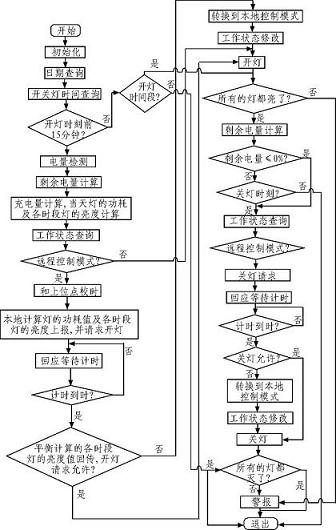 進行太陽能路燈電池板電流檢測,蓄電池電壓檢測,蓄電池電量監(jiān)測,以及環(huán)境溫度的檢測,采用光開時關,并實時上傳工作環(huán)境及狀態(tài)數(shù)據(jù),預警故障,保證系統(tǒng)的可靠性。圖2為太陽能路燈的開、關控制流程網(wǎng)。