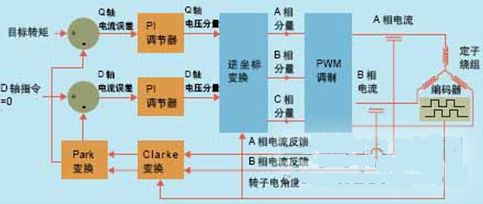 從控制原理上講,磁場定向控制方法的電流環(huán)運行是獨立于電機旋轉(zhuǎn)的。在FOC方法中存在兩個實際的電流環(huán),一個用于Q軸轉(zhuǎn)矩,另一個用于D軸轉(zhuǎn)矩。Q軸轉(zhuǎn)矩電流環(huán)施以來自伺服控制器的用戶目標轉(zhuǎn)矩,D軸電流環(huán)則施以零輸進指令,以便使不想要的直軸分量降至最低。