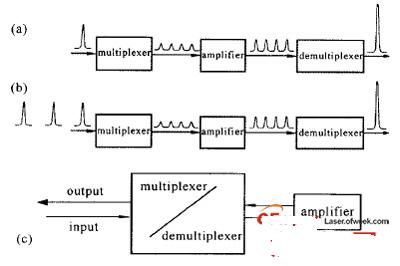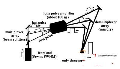 對于準分子激光放大器,由于激活介質的上能態儲能時間很短,必須連續補充瞬態儲能(Em)才能獲得高能輸出,即E=EmT/t,其中T是增益時間,t是增益恢復時間。對于電子束泵浦的準分子激光放大器,增益時間可以長達200ns,T/t≈100,這意味著對于單個要放大的短脈沖,只能提取出很小一部分能量。為了持續提取出放大器中的儲能,通常使用光學多路編碼技術。