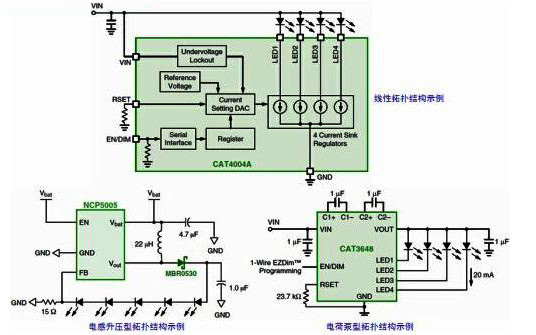 圖1: 低壓便攜設(shè)備應(yīng)用的不同LED驅(qū)動(dòng)器拓?fù)浣Y(jié)構(gòu)示例