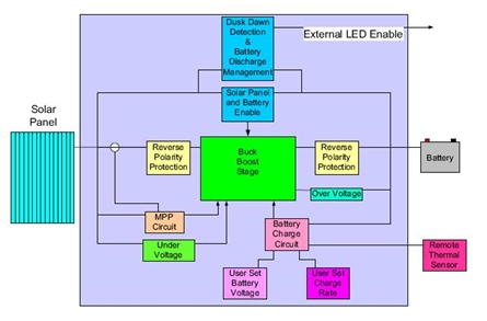 在白天時間系統對電池充電,而在夜間電池放電照亮定義的空間。雖然輸入能量不能保證,但輸出能量可在相當長的時間保持不變。如果一個系統的大小不合適,電池可能因放電而損壞。要防止電池損壞,必須用 LED 電路抑制操作,防止電池耗盡。