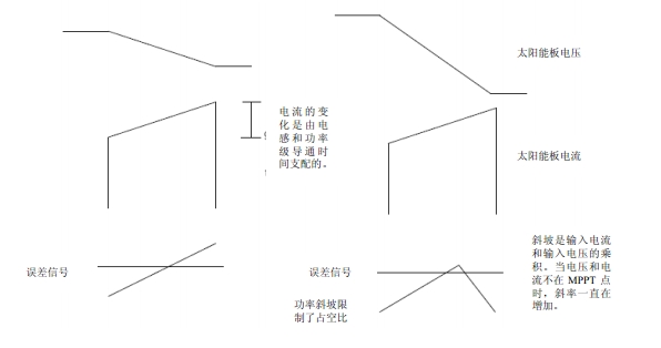 為了從功率可變的電源(即太陽能電池板)析取出最大的功率,太陽能控制器必須采用 MPPT。MPPT 必須首先找到最大功率點并及時調整環境條件,以保持控制器接近最大功率點。動態 MPPT 用在系統發生改變的情況下。由于每個開關周期都在發生變化,太陽能電池板汲取的功率也會在每個周期有明顯的改變。動態MPPT利用太陽能電池板的電壓驟降乘以每個開關周期增加的電流,以確定將要產生的誤差信號來調節占空比。動態響應可檢測 IV 曲線的斜率,從而建立一個功率斜坡,從誤差信號相交點建立一個代表占空比的功率。當斜坡變化斜率從正到負時該周期結束,如圖 2 所示。