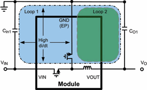 在規劃電源布局時,首先要考慮的是兩個開關電流環路的物理環路區域。雖然在電源模塊中這些環路區域基本看不見,但是了解這兩個環路各自的電流路徑仍很重要,因為它們會延至模塊以外。在圖1所示的環路1中,電流自導通的輸入旁路電容器(Cin1),在高端MOSFET的持續導通時間內經該MOSFET,到達內部電感器和輸出旁路電容器(CO1),最后返回輸入旁路電容器。