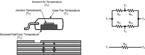 現在來快速了解一下如何進行不含散熱片的簡單PCB散熱設計,圖3示意了模塊及作為熱阻抗的PCB。與從結到裸片焊盤的熱阻抗相比,由于結與外封裝頂部間的熱阻抗相對較高,因此在第一次估計從結到周圍空氣的熱阻(θJT)時,我們可以忽略θJA散熱路徑。
